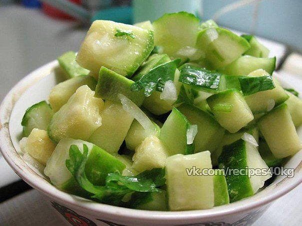 5. Слить образовавшийся сок с кабачков, добавить лук, укроп, огурцы, яблоко и заправку.