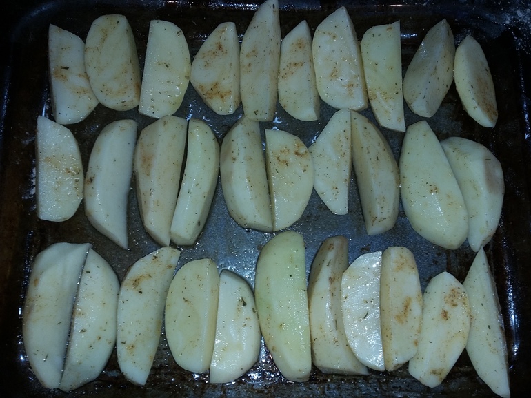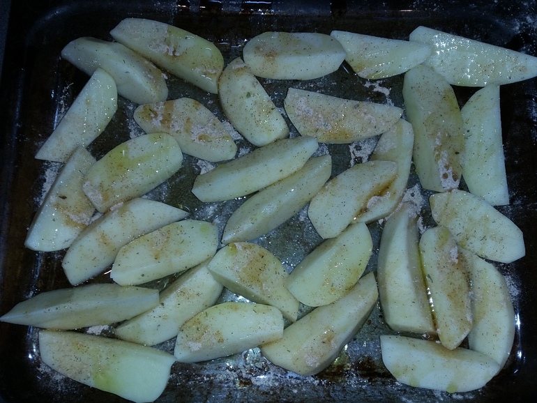 Разложить на противне. Посыпать приправой для картофеля, сбрызнуть оливковым маслом: