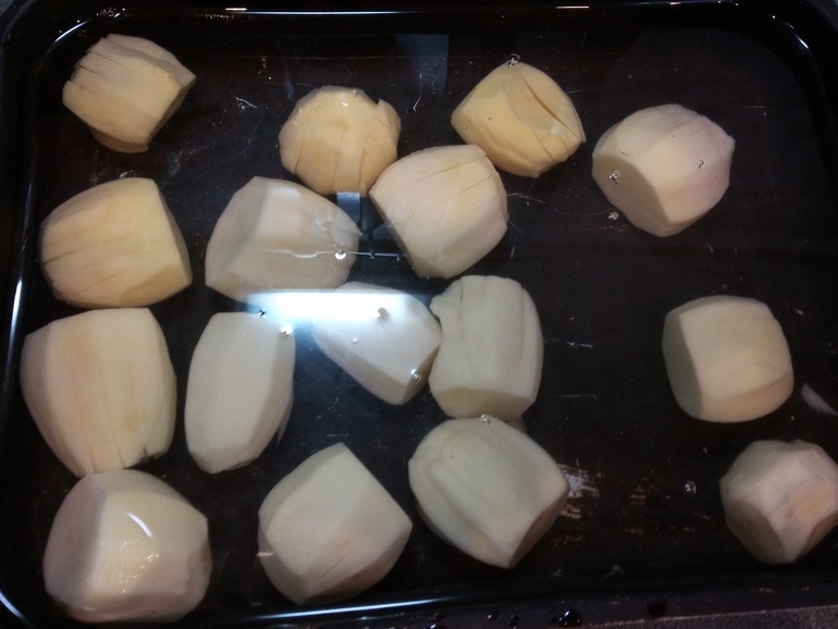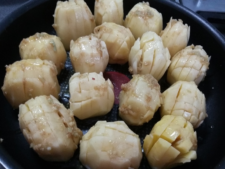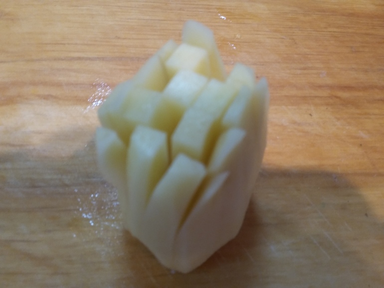 Лучше использовать старую картошку, она лучше пушится. Но у меня уже только молодая есть. Очистить небольшие клубни, сделать надрезы: