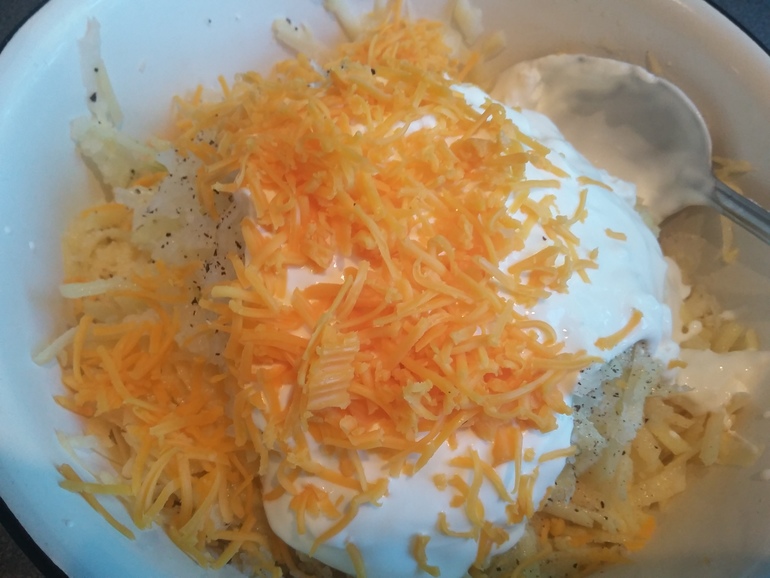 Добавить 3 ст.л. жирной сметаны и 100 г натертого Чеддера: