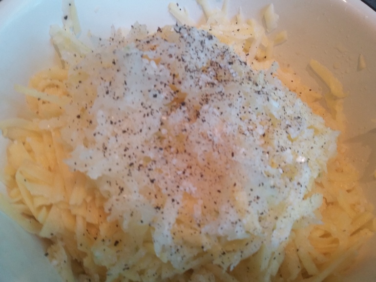 Натереть на крупной терке 4 сырые картофелины и 1 луковицу: