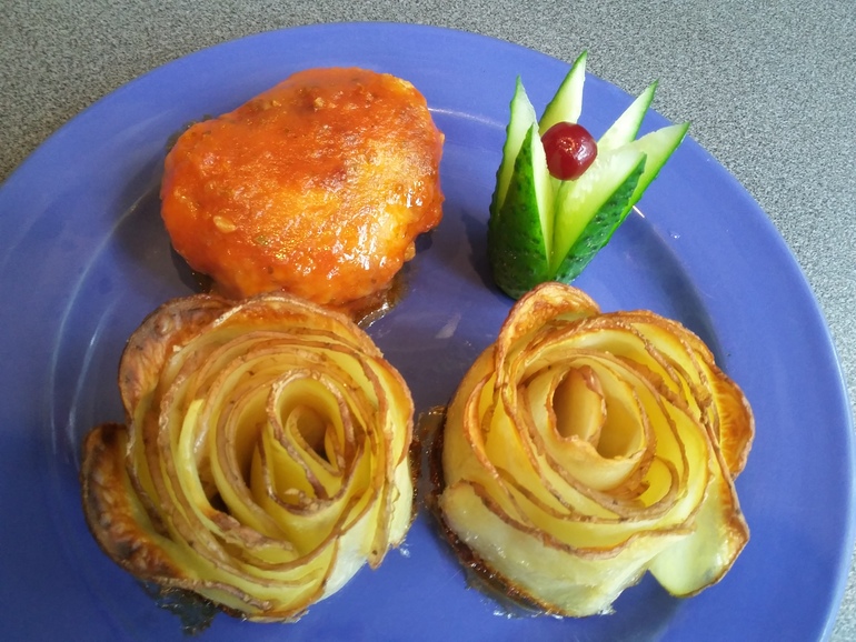 В этот раз у нас картофельные ломтики, хризантемы, розы и картофель "Романофф".