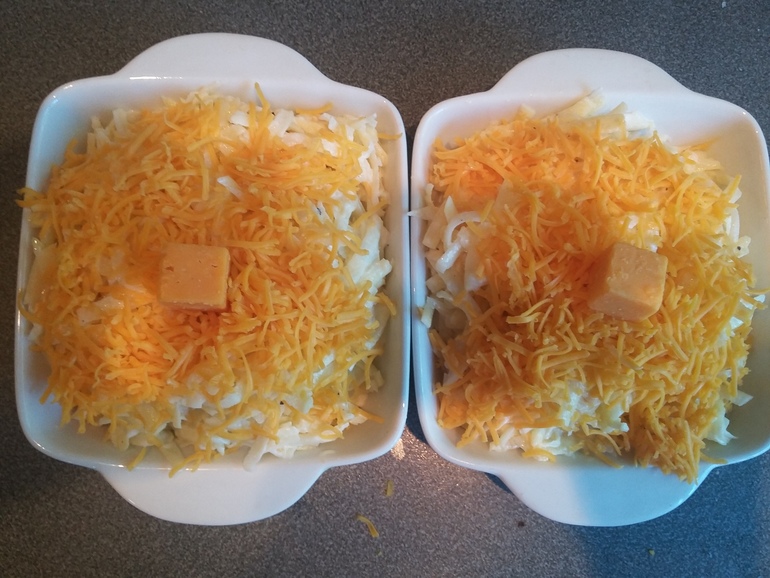 Перемешать, Разложить по формам для запекания, смазанными маслом. Посыпать острым сыром: