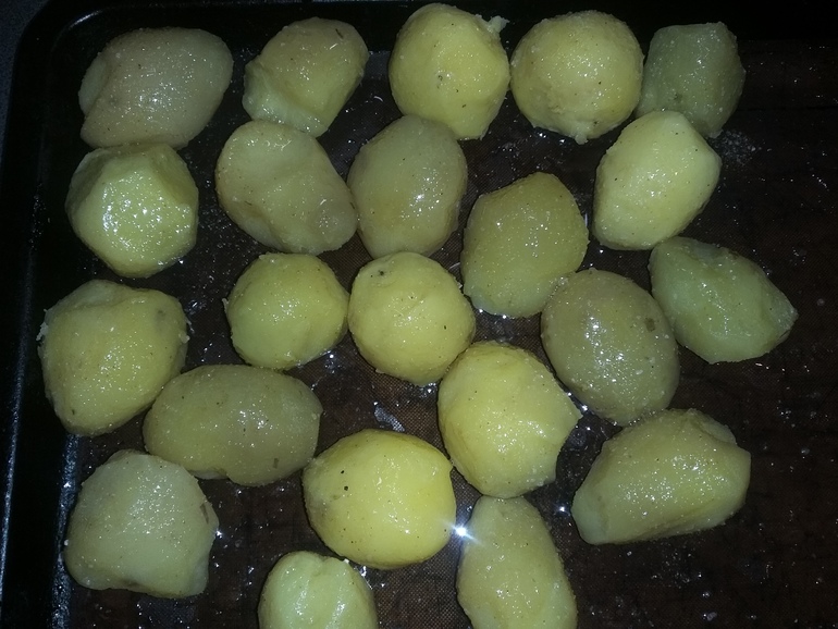 Смазать картофель. В оставшееся масло добавить специи для рыбы и черный перец. Смазать рыбу: