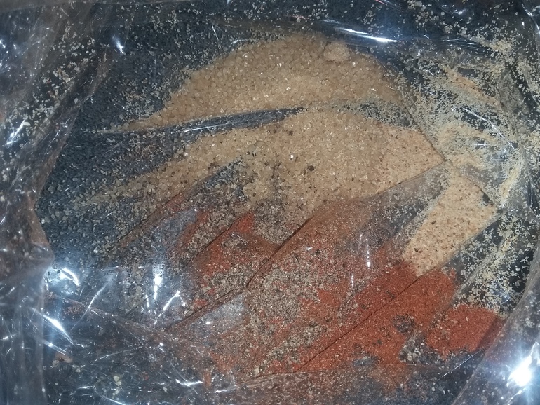 В пакет для запекания насыпать соль, сахар, паприку, чили, сухой чеснок: