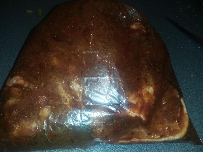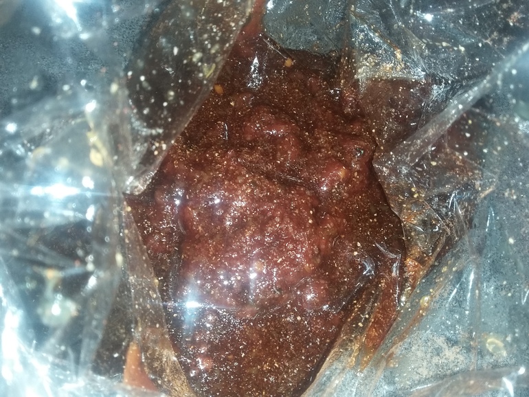 Перемешать маринад, положить туда ребрышки. Завязать пакет и потрясти для равномерного распределения маринада по мясу: