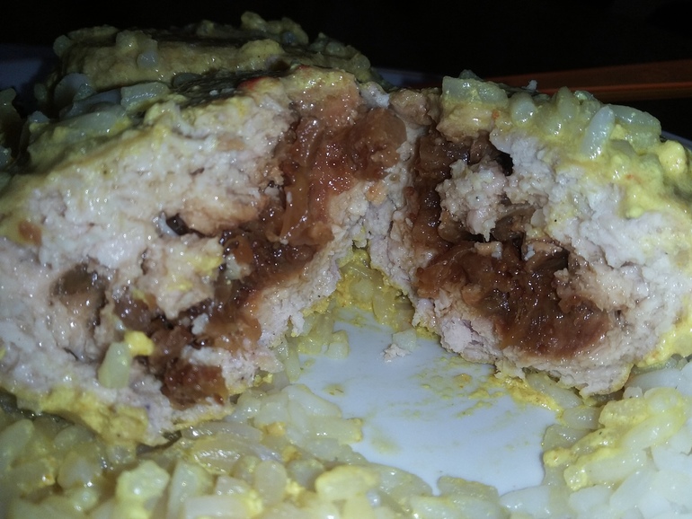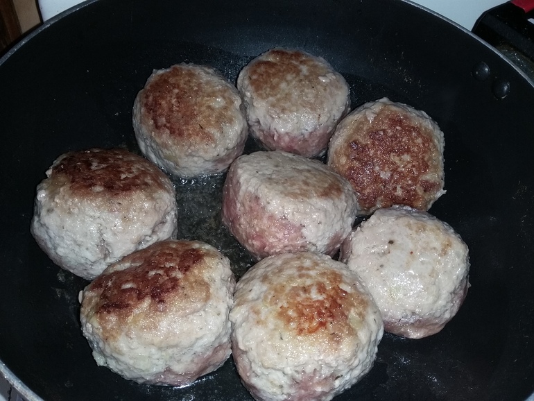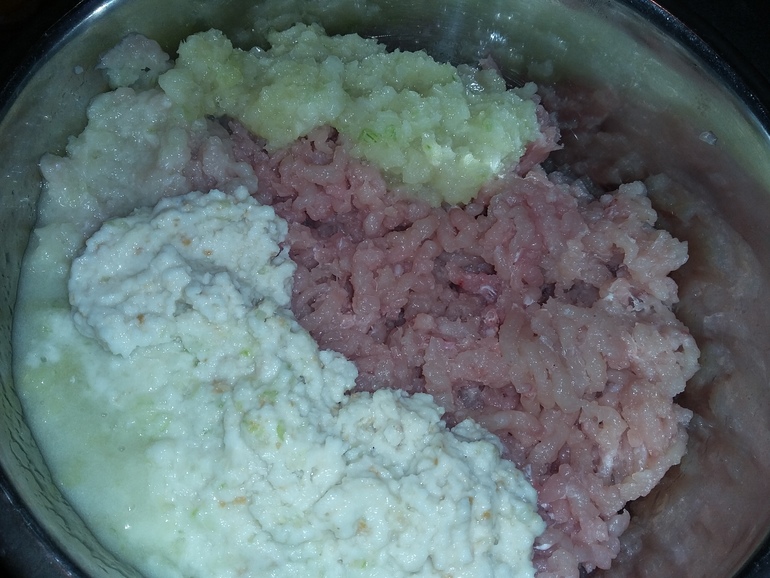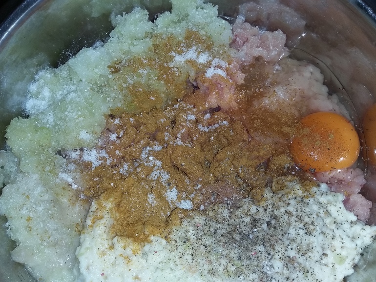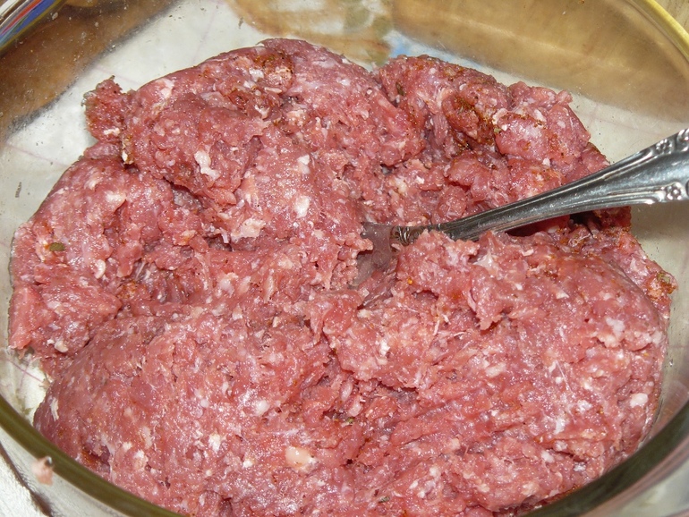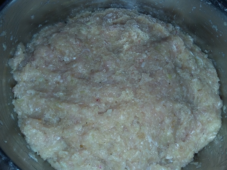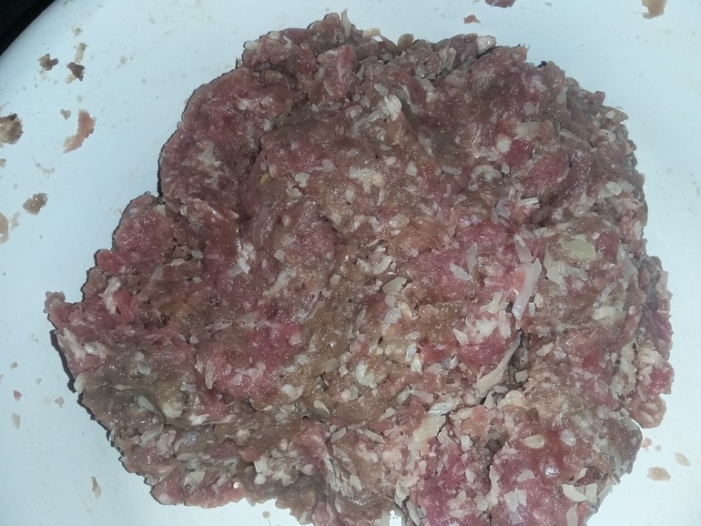 Смолоть мясо и лук, посолить, поперчить, перемешать: