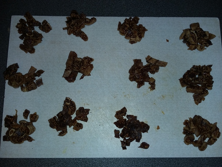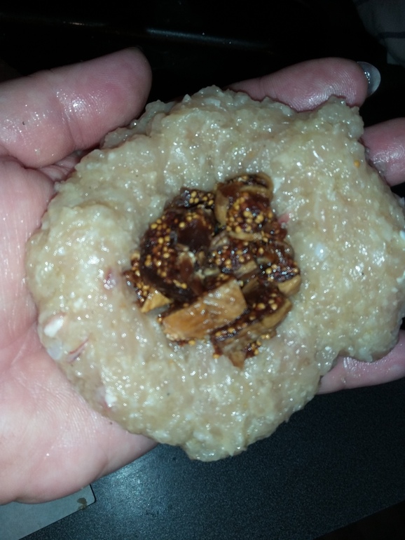 Набрать в руку фарш, расплющить в лепешку, положить порцию инжира: