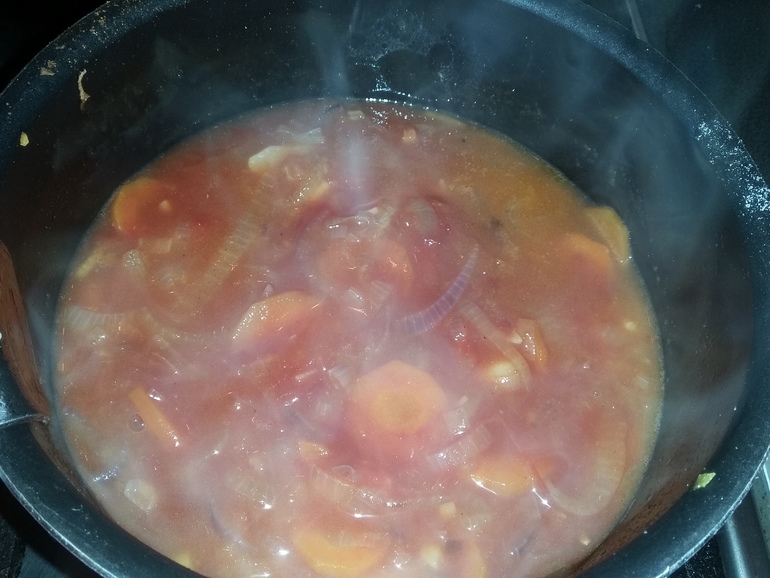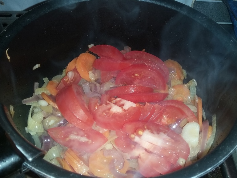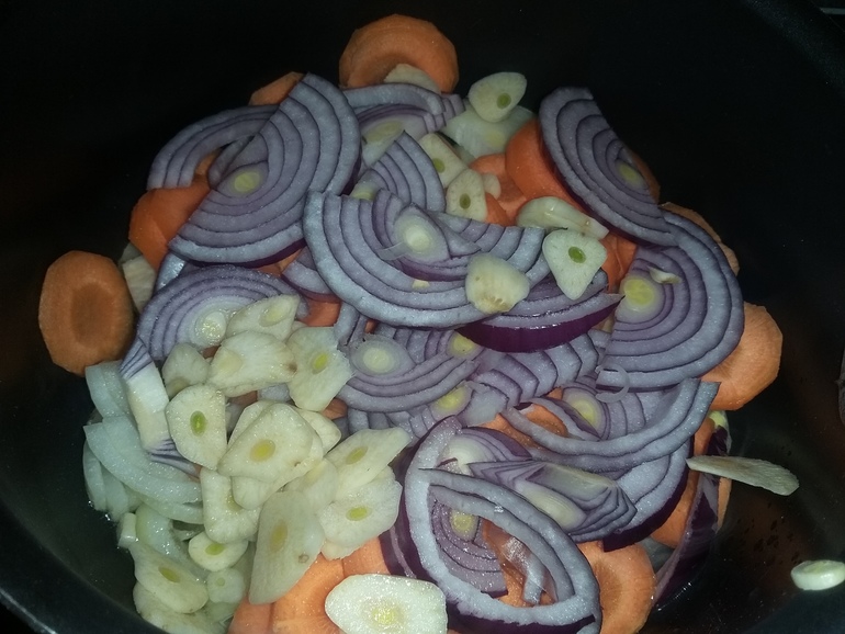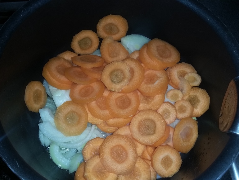 Закрыть фольгой, тушить 30 минут. В это время спассеровать в сотейнике лук и морковь: