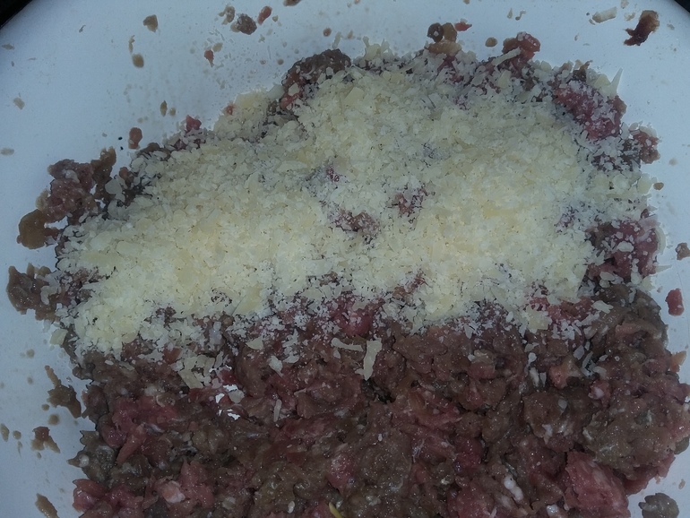 Посолить, поперчить, добавить яйцо и натертый пармезан: