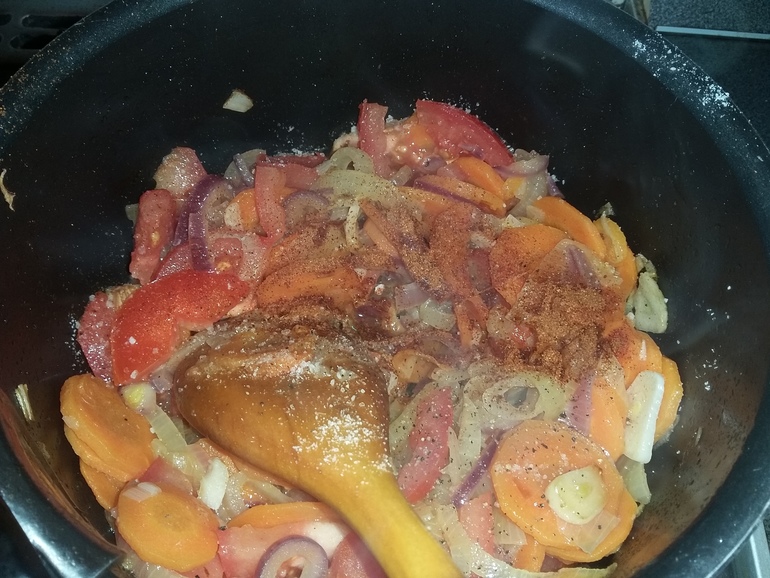 Добавить соль, паприку, черный перец, перемешать, добавить немного воды: