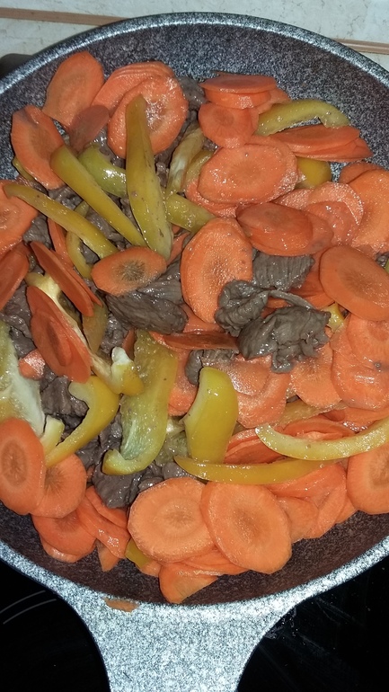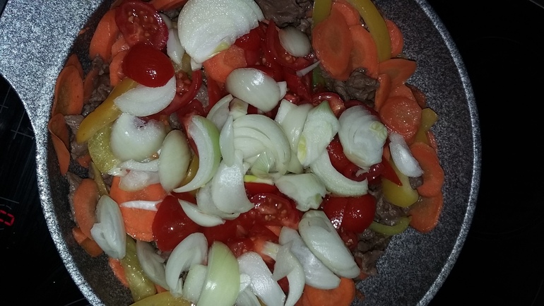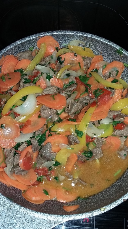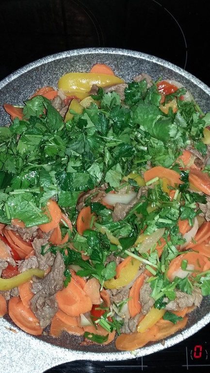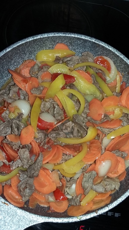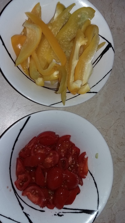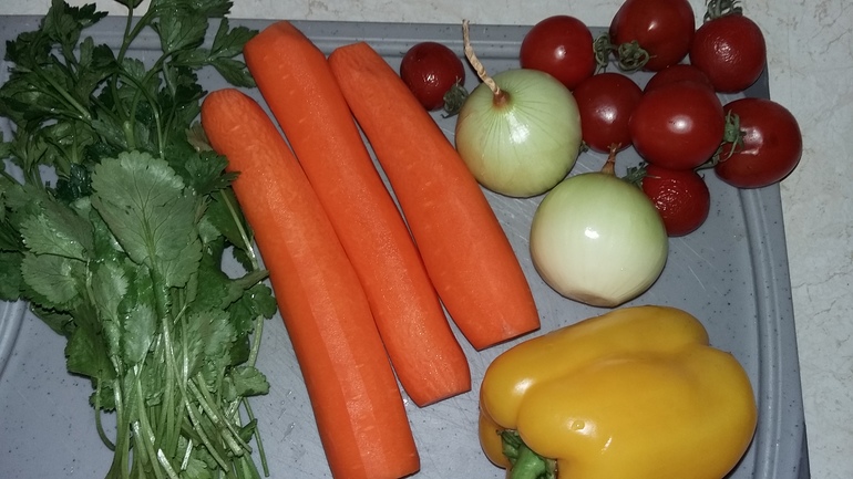 у меня 3 тонкие моркови, 1 сладкий перец, 2 головки лука небольшие, пучок зелени, и немного маленьких помидор.