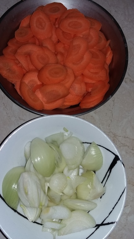 Морковь режем тонкими пластинами, лук крупно как бы шинкуем.