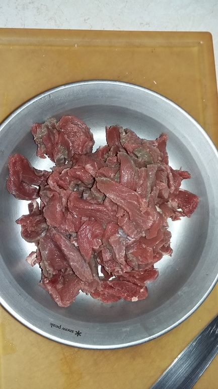 Мясо (на фото 350 гр.) порезать тонкими пластинами.
