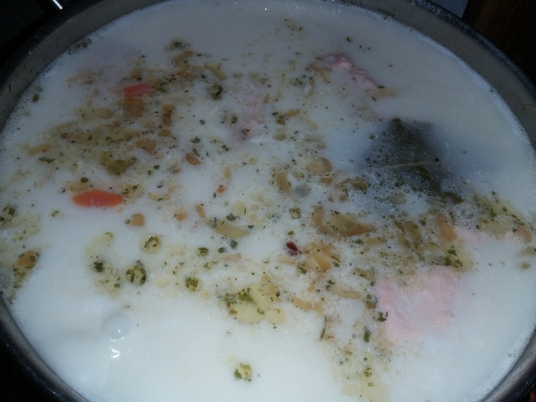 Когда рыба будет готова влить кипящие 20% сливки и дать им закипеть в супе:
