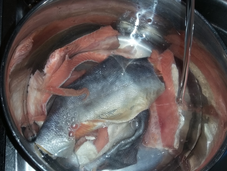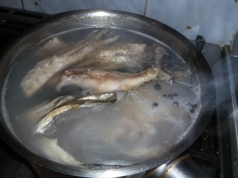 Все остатки, включая кожу и хребет, хорошо промыть, залить холодной водой и сварить бульон, добавив после закипания соль и перец: