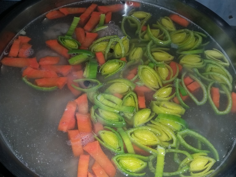Через 5 минут добавить лук порей: