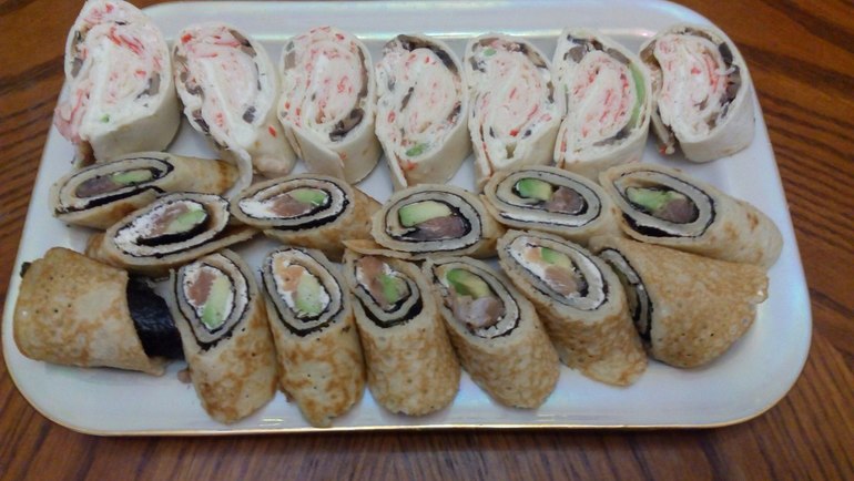 Берем блин, на него кладем лист нори. Смазываем творожным сыром, какой больше нравится. кладем с краю, по всей длине кусочек авокадо, малосольную рыбу и сворачиваем рулетом, поплотнее.