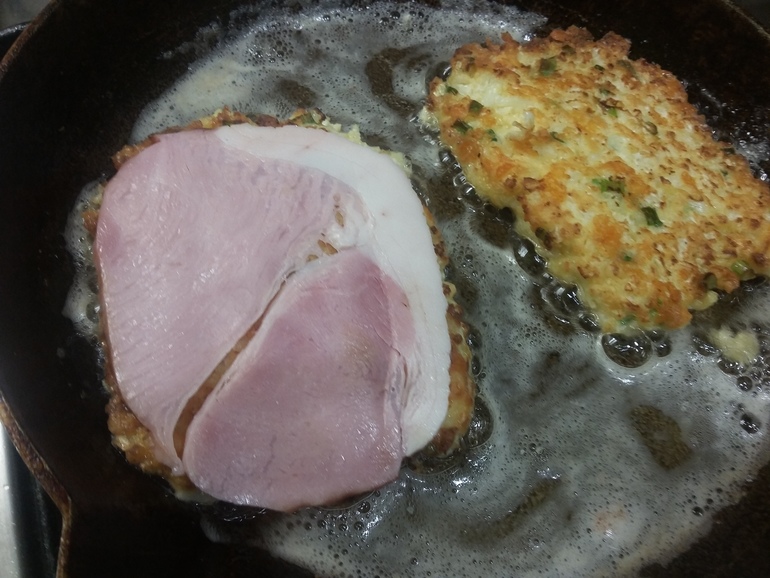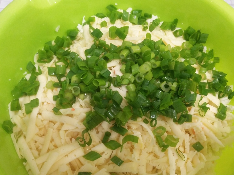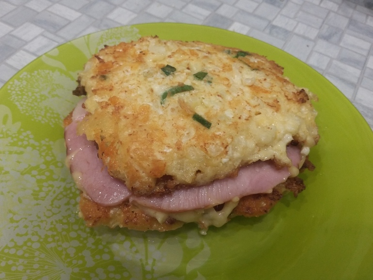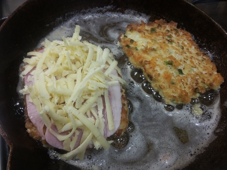 Выложить 2 ст.л. смеси на сковородку с горячим оливковым маслом. Лопаткой придать форму квадрата: