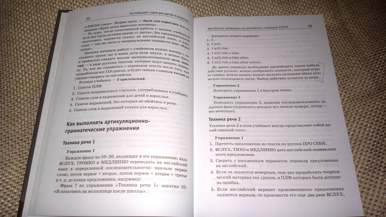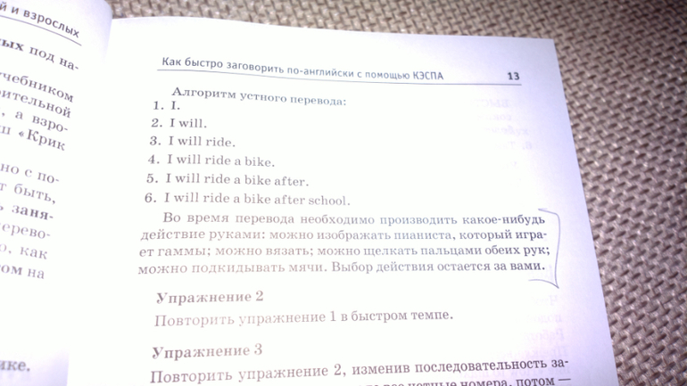 Мне очень понравились упражнения "Техника речи" из этой методики. Автор предлагает каждую фразу переводить на английский язык в определенной последовательности: вначале первое слово, затем первое + второе, потом первое+второе +третье и т.д до конца предложения. У меня это сработало! Я учила язык в школе, была у меня "5", потом в институте я поняла, что язык я не знаю ( хотя и там была у меня "5") и уже после института я предпринимала попытки подтянуть язык и все осталось на прежнем уровне. И вот уже у меня подрос сын и заинтересовался языком и только сейчас я нашла работающую ( для меня) методику! И у меня что-то щёлкнуло в голове.