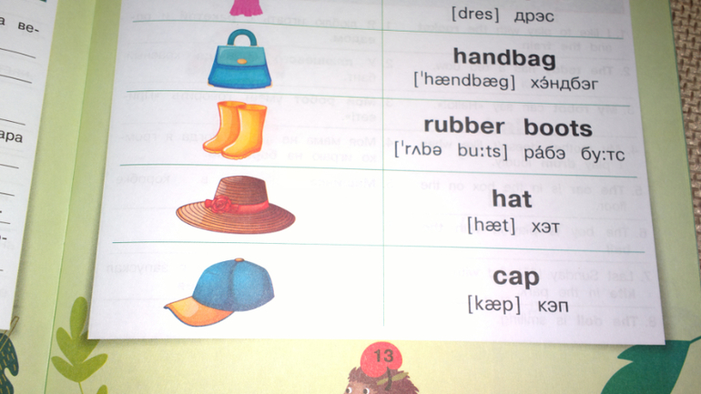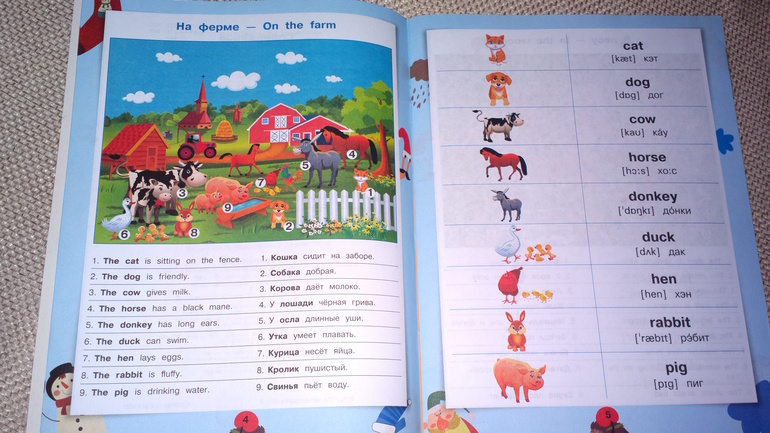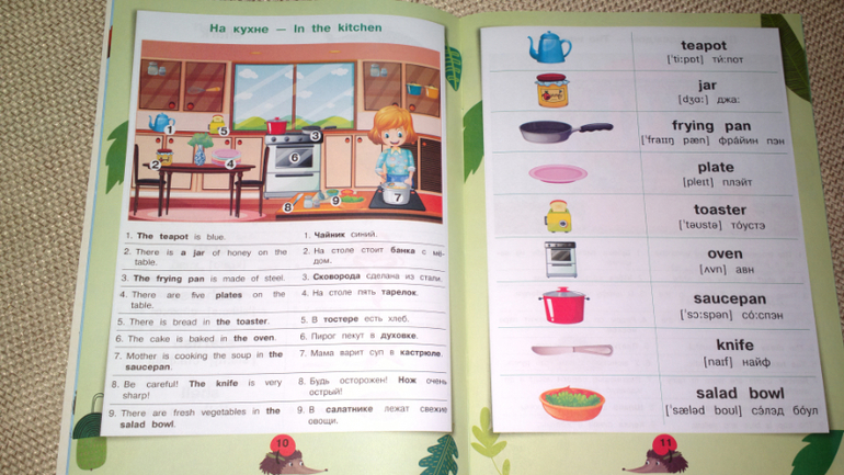 Под картинками выписаны слова и отдельные предложения с переводом.