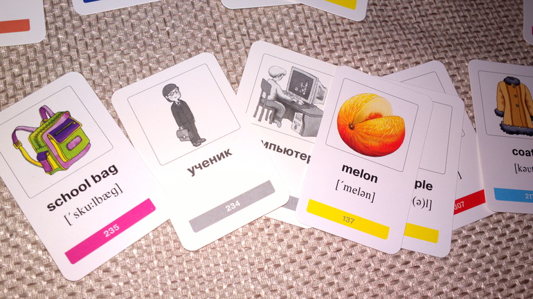 Как вы уже могли увидеть, у карточки две стороны: английская и русская. На английской стороне картинка цветная, под ней слово на английском и транскрипция.