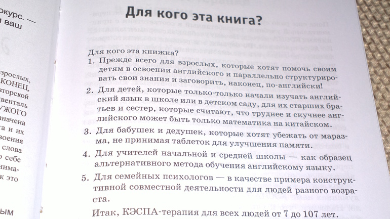 В аннотации написано:"книга представляет собой учебно-методическое пособие, которые хотят помочь своим детям и себе ЗАГОВОРИТЬ, НАКОНЕЦ, ПО-АНГЛИЙСКИ! " Если регулярно заниматься по этой методике, то действительно, заговорите.