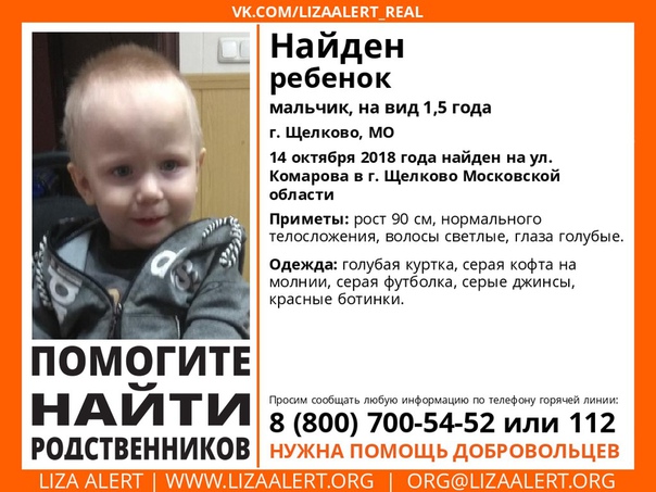 14 октября в г. Щелково Московской области был найден мальчик. Возможно, что малыш проживал в другом городе.