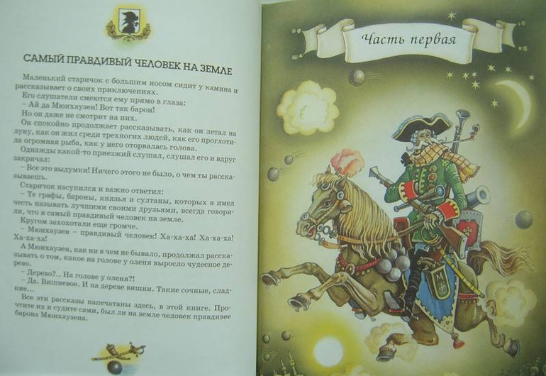В основу фантастических "Приключений барона Мюнхаузена" положены рассказы действительно жившего в XVIII веке в Германии барона Мюнхаузена. Он был военным, некоторое время служил в России и воевал с турками. Вернувшись в своё поместье в Германии, Мюнхаузен вскоре стал известен как остроумный рассказчик, выдумывавший самые невероятные приключения. Неизвестно, сам ли он записал свои рассказы или это сделал кто-то другой, но в 1781 году некоторые из них были напечатаны. В 1785 году немецкий писатель Э. Распе обработал эти рассказы и издал их. Впоследствии к ним были присоединены фантастические рассказы других писателей о приключениях Мюнхаузена. Но автором книги принято считать Э. Распе. В этом произведении отразились характерные черты немецких баронов и помещиков: некультурность, самоуверенность и хвастливое зазнайство. Когда книга получила известность, то именем Мюнхаузена стали называть людей, постоянно лгущих и приписывающих себе те качества, которых у них нет.