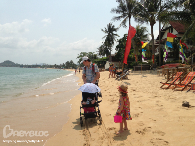 Пришлось немного протащить коляску. Вообще по мокрому плотному песку, как на пляже Чонг Мон она едет хорошо.