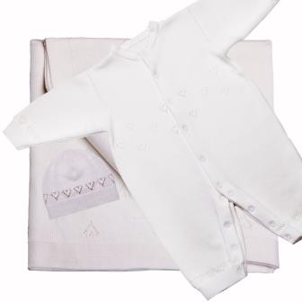 Теперь жалею, что сразу не купила. Тогда подумала, что на выписку летом жарко, хотя консультант говорила, что и для лета прохладного отлично и на осень еще подойдет по размерам, т.к. там комбез с открытыми ножками и манжетами, можно подвернуть, если чуть велик при выписке, а потом по мере роста ребенка отгинать манжеты. Цена недешевая, но то, что комплект не разовый на выписку и все, а будет использоваться, одеваться как минимум три месяца, там и плед суперский, и шапочки отлично тянется (может и до полгода хватит) и комбез очень понравился и все в таких классных сердечках - сейчас бы 100% купила! При нынешней погоде в Москве. Первому покупала шупет на выписку набором, но одевали один раз, уже через 1,5 недели вырос из выписного, хотя цена недешевая тоже была. А тут точно надольше хватит.