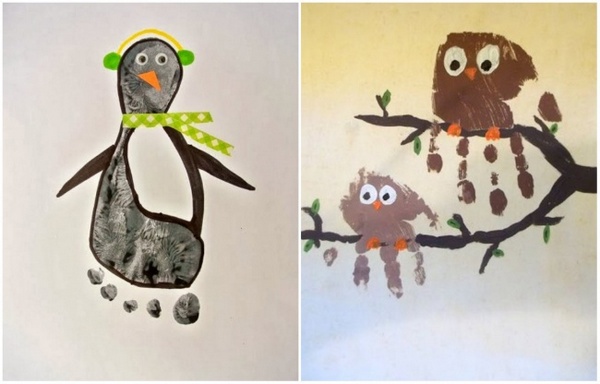 С помощью отпечатков ладошек и даже ног можно делать очаровательные рисунки. Вот, например, мама-русалка гуляет с дочкой по океану. Или совы отдыхают на ветке.