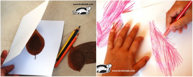 Соберите красивые листья в парке, почистите их от пыли и грязи, прогладьте утюгом, чтобы они распрямились. Вложите листья между листами бумаги, возьмите мягкие карандаши или пастельные мелки и начинайте волшебство: просто закрашивайте лист сплошными мазками, и на белой бумаге появится лист со всеми своими крупными и мелкими прожилками.