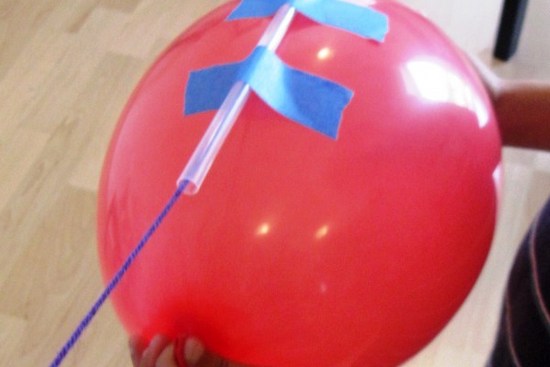 Натяните веревку между двумя стульями, предварительно продев ее в соломинку. Надуйте воздушный шарик (но не завязывайте) и прикрепите скотчем к соломинке. Отпускаем шарик ... и запускаем ракету!