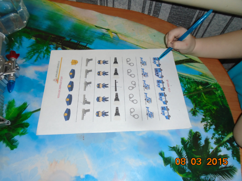 Провели мы замечательное ТЗ «Полицейский» от Светланы. Рассказывать о полицейских, о работе, их машинах, обмундировании я начала заранее, чтобы заинтересовать сына. Останавливались рассматривали полицейские машины, смотрели, как шел по улице наряд полицейских.