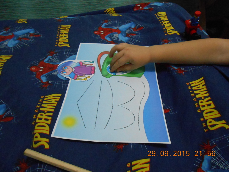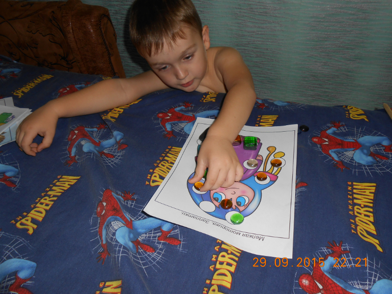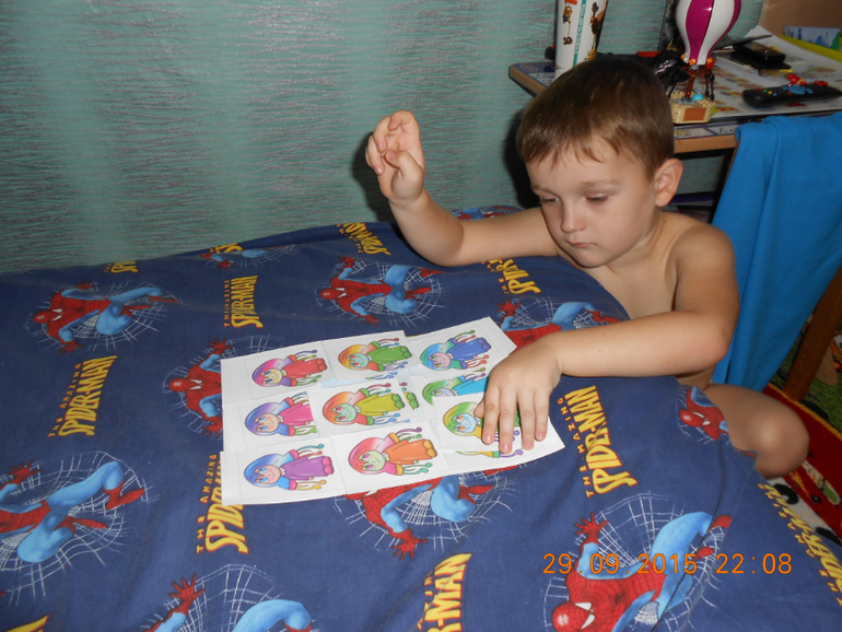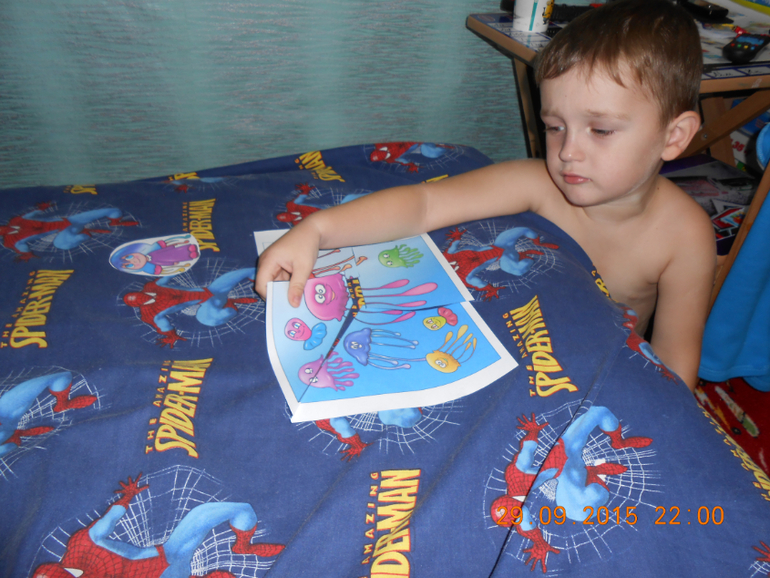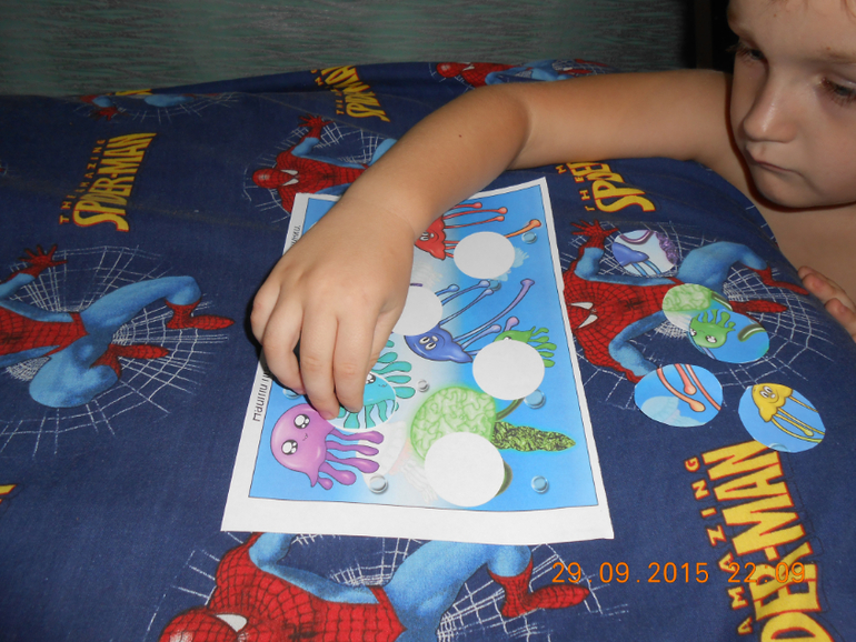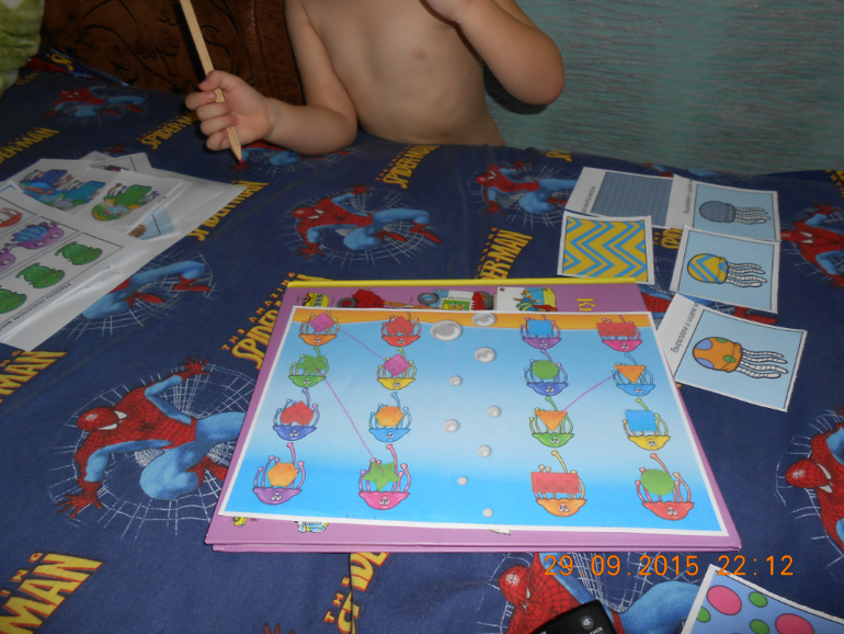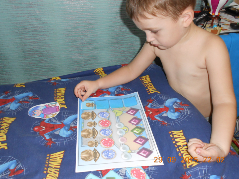 Играем мы по настроению сына, и чаще всего, вечером, перед сном и на диване. Заниматься за столом сын не любит.