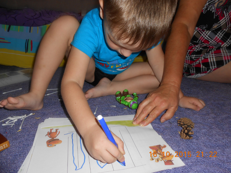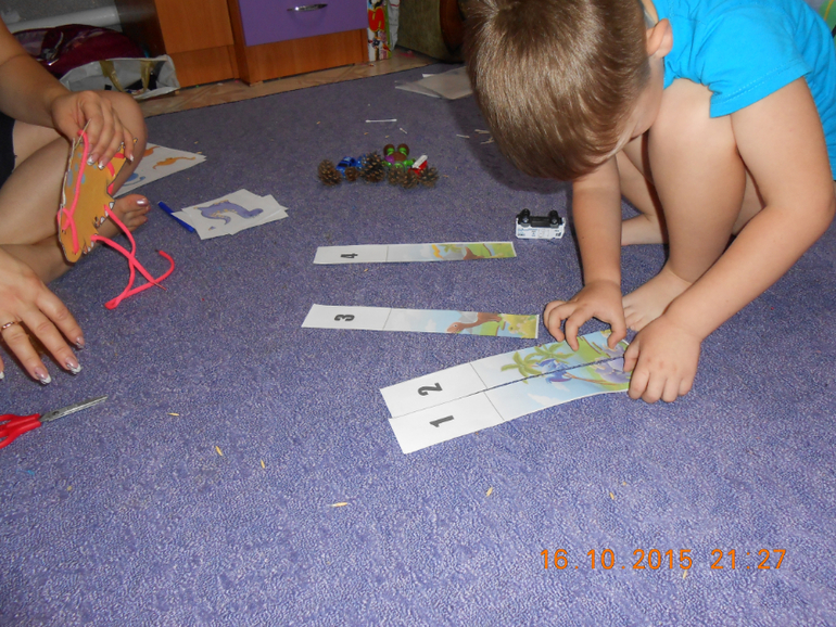Потом мы выполняли задания из печатного материала, шнуровали, раскрашивали, вырезали клеили, искали лишнее, собирали пазл и повторяли счет.