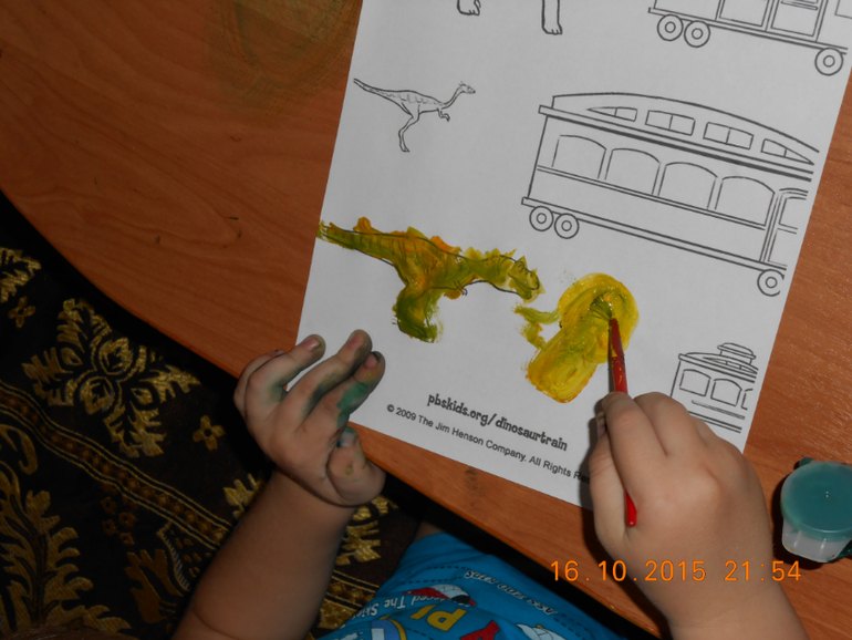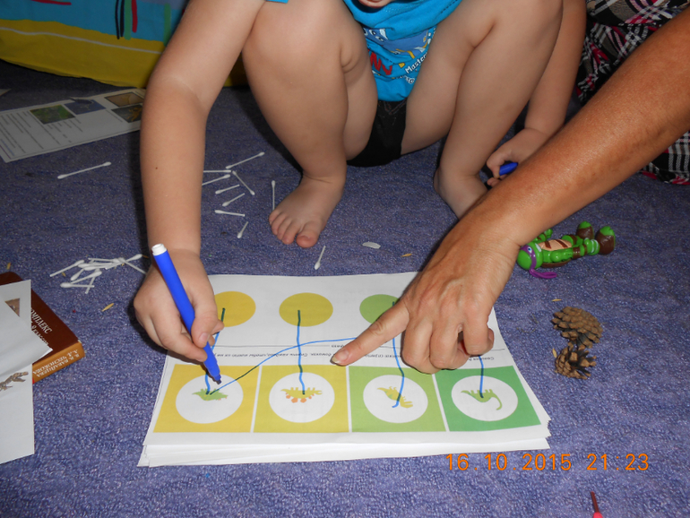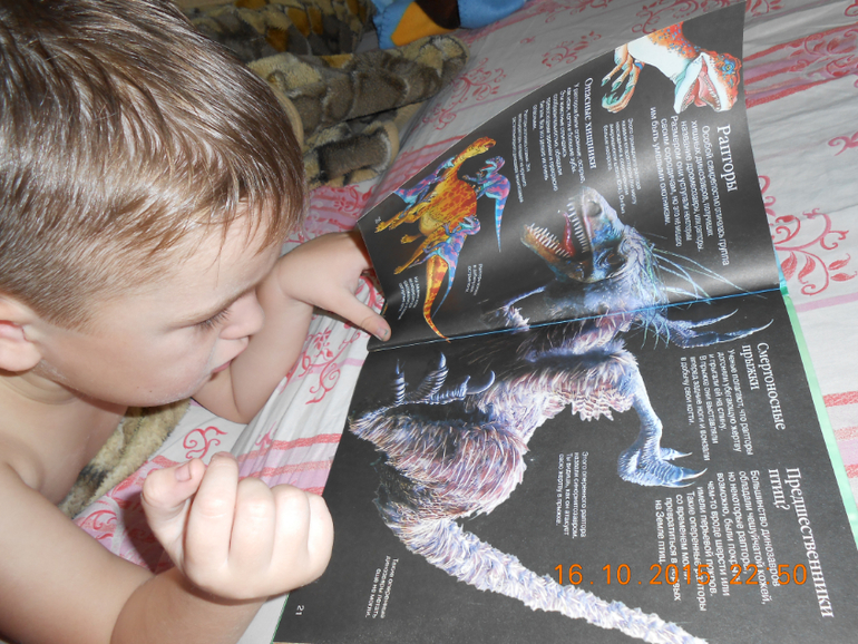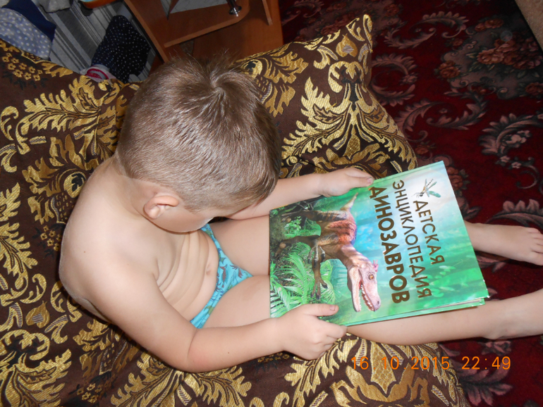 Утром сын проснулся, пришел с книгой. И пока мы собирались на работу, попутно ему читали о динозаврах. Распечатали материал, показали задания и днем заниматься с сыном будет бабушка.