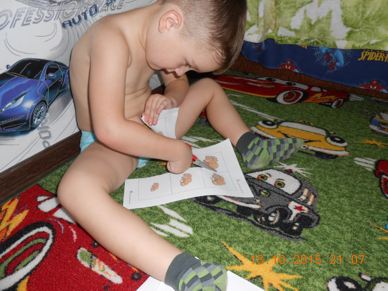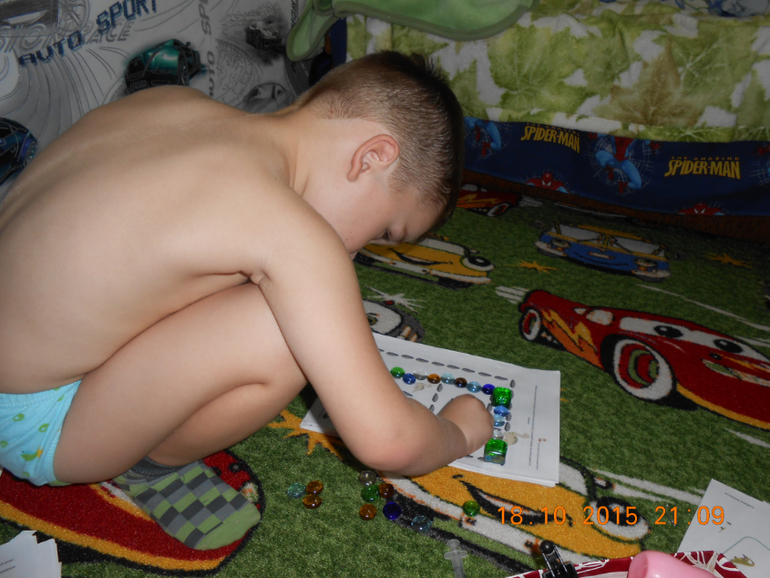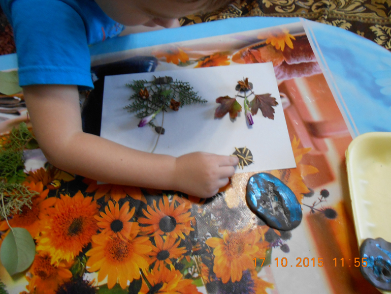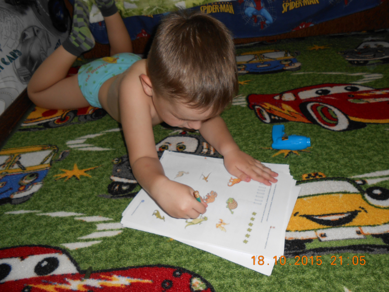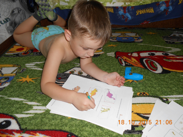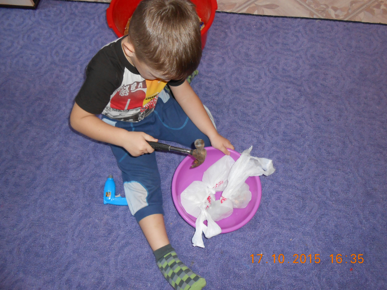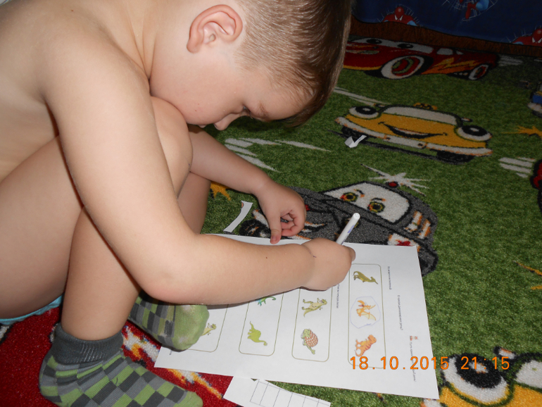 Сын остался с бабушкой и в течение дня играл с динозавриками: делал отпечатки, собирал по косточкам, раскопки устраивал, делал осеннюю картину, собирал пазл, находил останки динозавров во льду