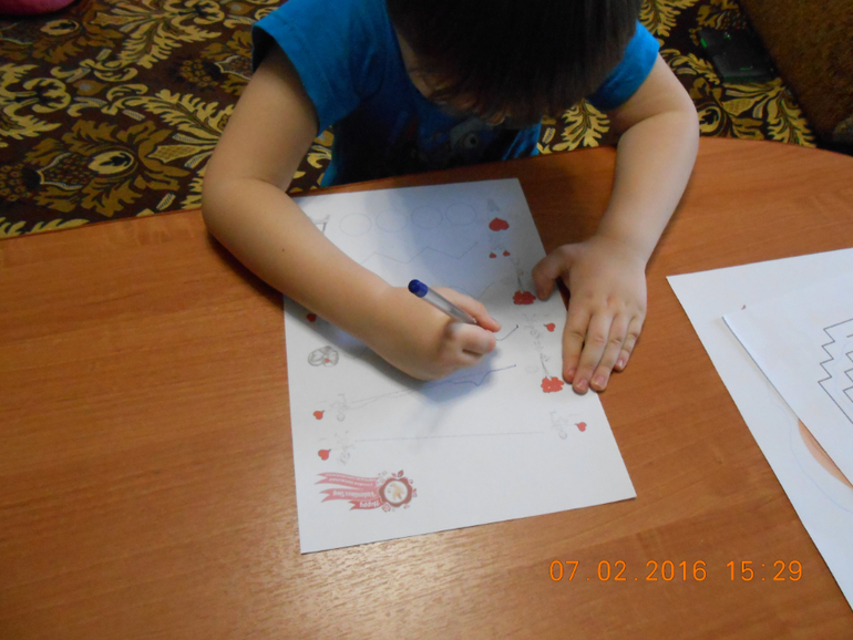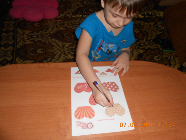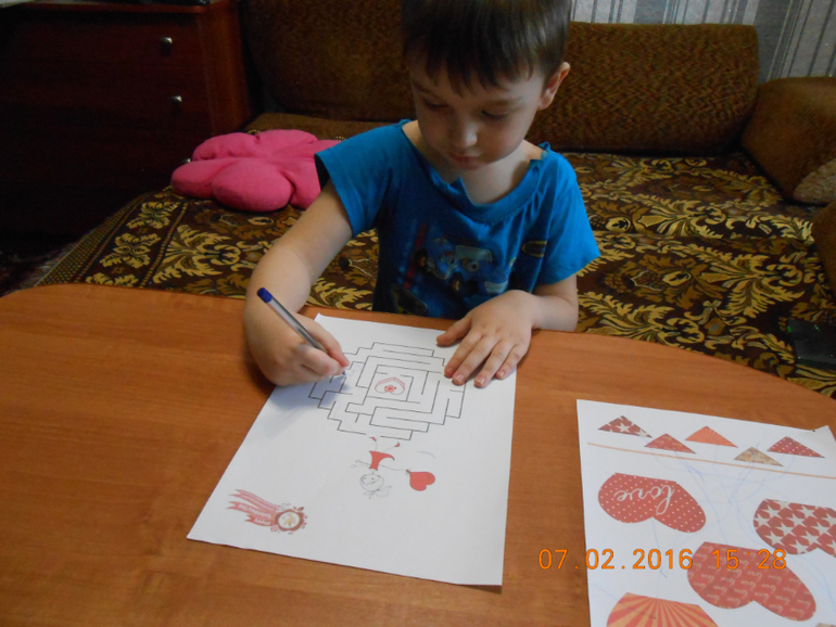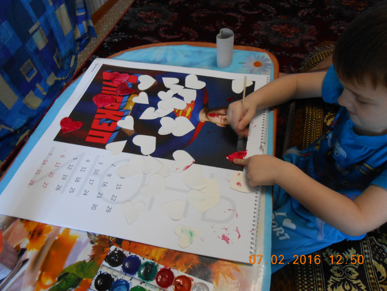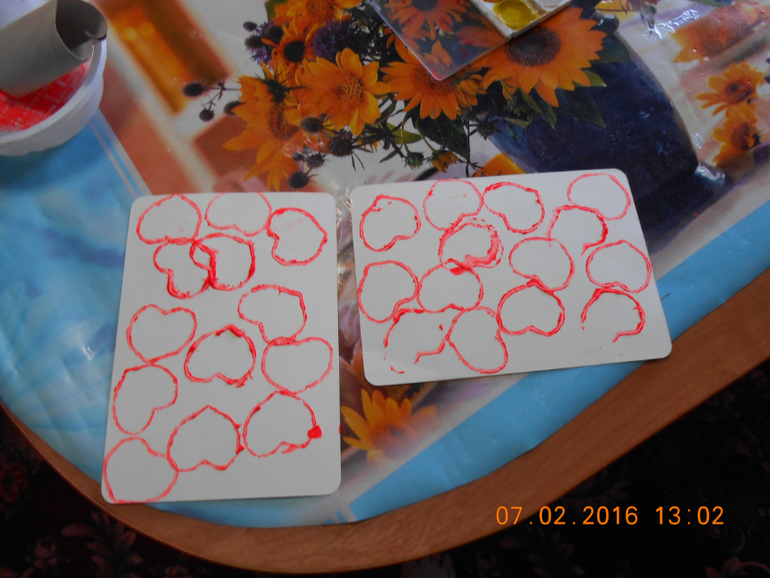 Готовиться у празднику мы стали заранее. Я с дочкой вырезала сердечки, сын их раскрасил, и сделал сердечки-отпечатки.Все это подсмотрела в контакте.
