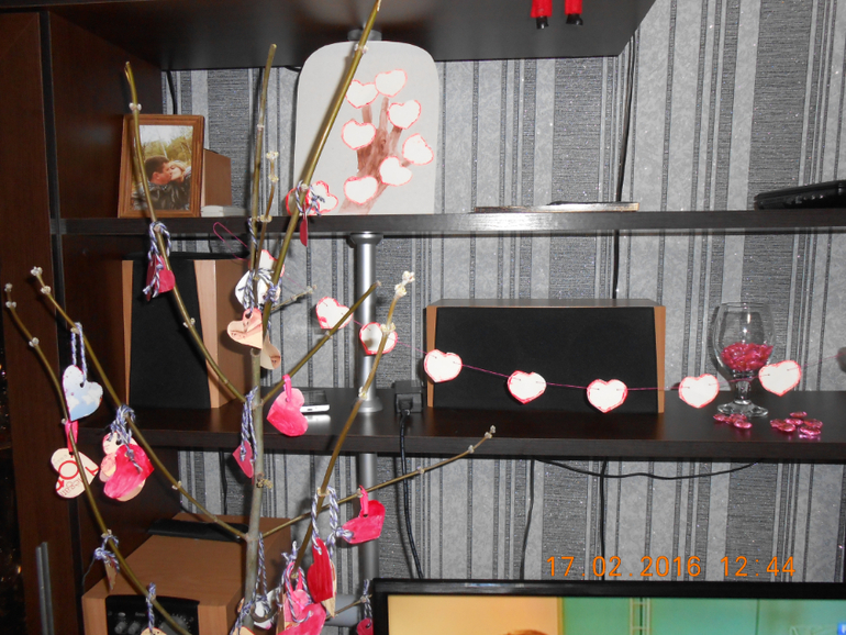 Я вырезала сердечки и получилась гирлянда, дерево с сердечками. Все делали с детьми.