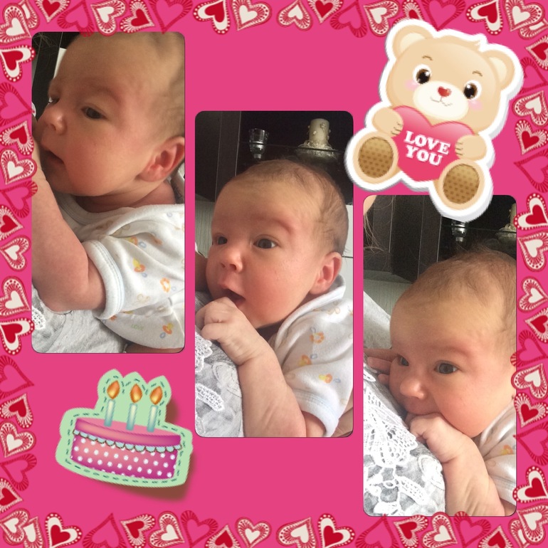 Начала улыбаться в ответ, может поймать взгляд и долго смотреть, следит за игрушкой, вертит головой. На животе поднимает голову, но пока еще не очень хорошо. Пытается уже что-то гулить, когда хорошее настроение.