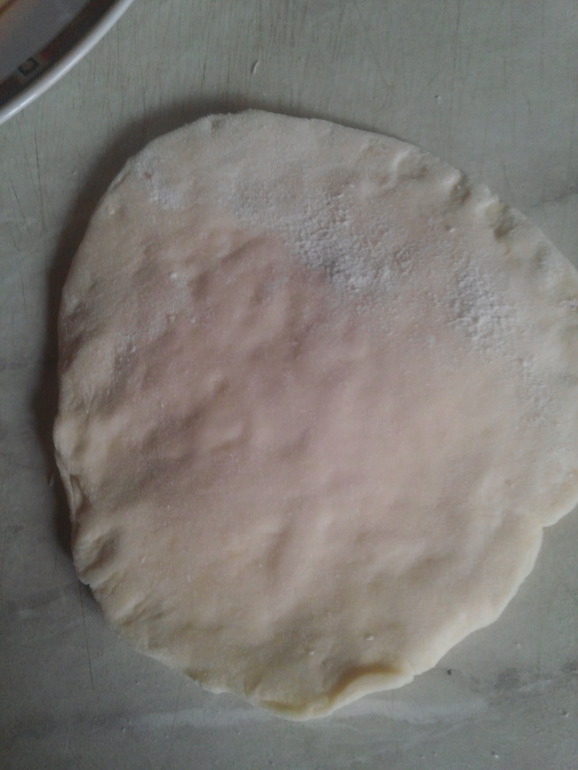 - Скатайте из теста шар. Полученную массу разделите на 4-6 частей, раскатайте лепешки толщиной примерно по 2-3 мм и положите внутрь начинку. Соедините края лепешки и очень аккуратно раскатайте еще раз.