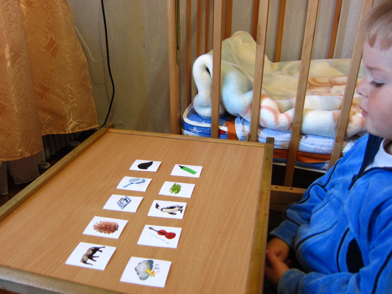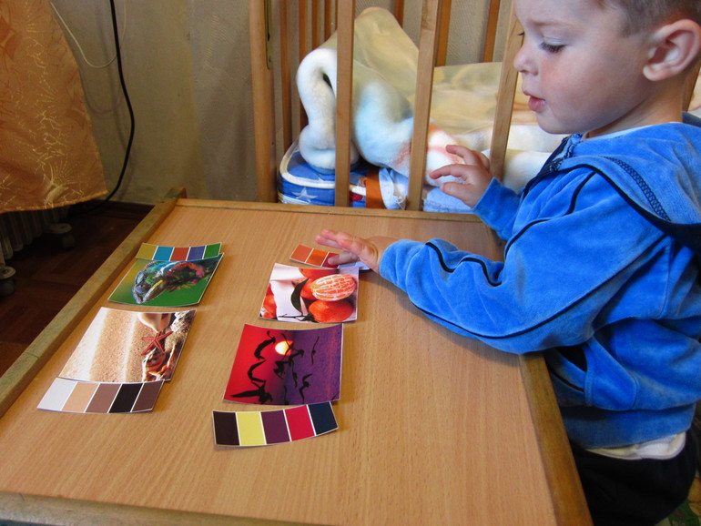 Цветовосприятие. Чтоб меньше путаться, предлагаю Максиму картинки попарно, в таком случае он справляется хорошо! Если сразу положить 3-4 картинки, пока путается!