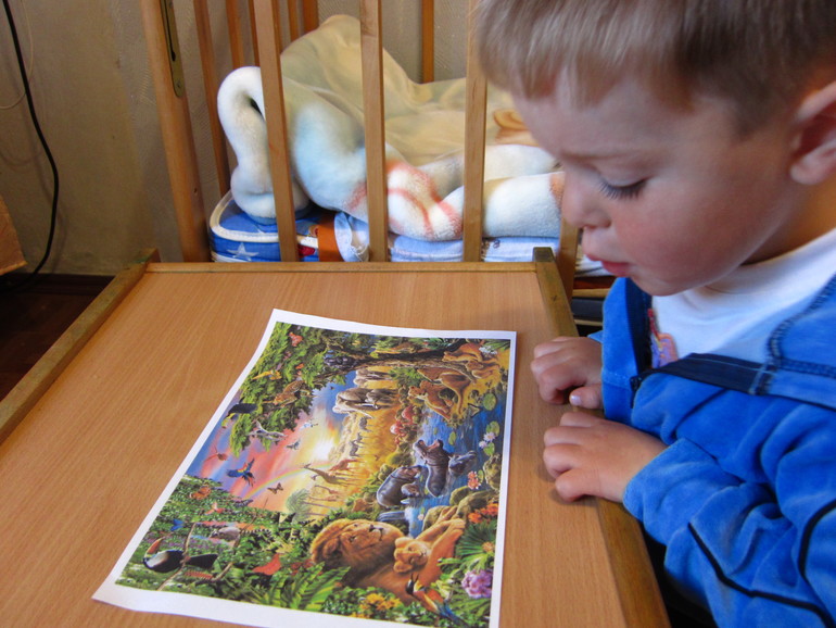 Разрезные картинки! Сложили жирафа! Сначала Макс не мог сообразить с чего начинать! Складывали вместе, нужно будет чаще предлагать подобные задания!