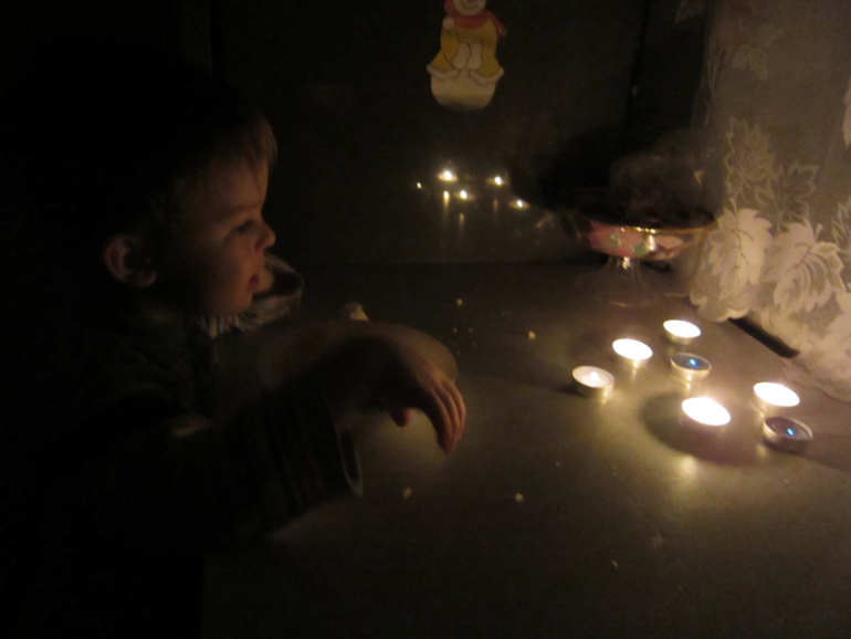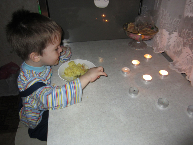 Решила сделать Максиму сюрприз, зажгла свечи и пригласила Максима на кухню ужинать! Зашел ребенок и спрашивает "Опять дяди свет выключили?")))) Дело в том, что в декабре у нас часто выключали свет вечерами, теперь оказывается, у Максима со свечками ассоциации, что другого источника света в квартире нет)))) А вообще понравилось, особенно задувать свечки)))
