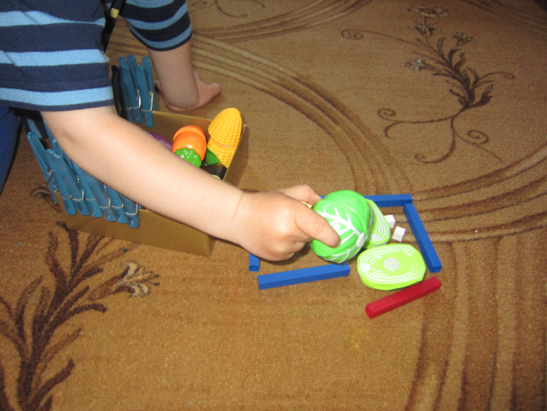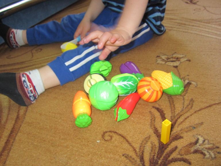 И тут Максим принес наши пластмассовые овощи, сказал что в магазине купил. Накормил всех козлят капустой, а волку дал лимон.