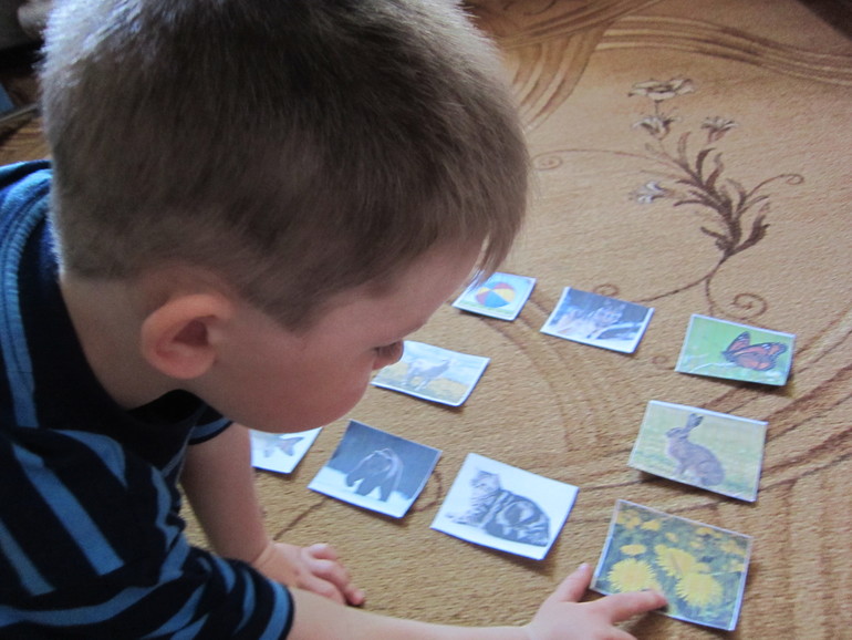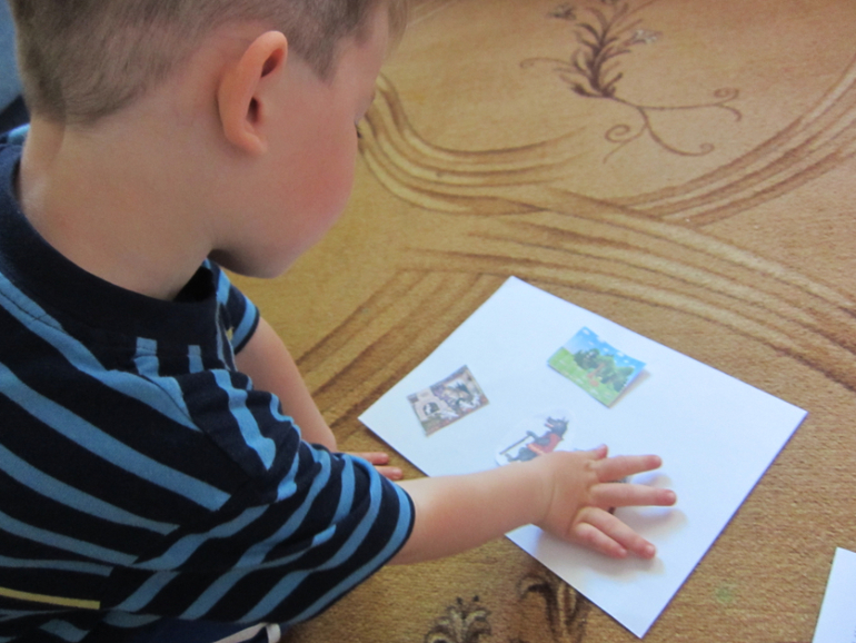 Для начала нужно было угадать сказку. Максим называл картинки по свойствам, которые я называла. В итоге осталось у нас три картинки: волк, коза и домик. я предложила Максиму вспомнить, в какой сказке у нас встречаются такие персонажи. Первой сказкой, которую Макс назвал была "Козел да баран" , а потом сразу же назвал "Волк и семеро козлят".