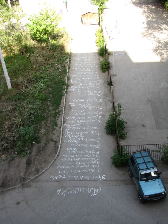 о_О а почему вверх ногами... там же нет высотки в той стороне... вернее есть, но на другой дороге бы тогда написали.... Мне однажды один мальчик написал перед балконом: "Аня, I like you" Формулировка была стремная, и я не знала кто это, но мы всем двором целый день подтрунивали))) На следующий день появилась пририсованная буква Т ;))))