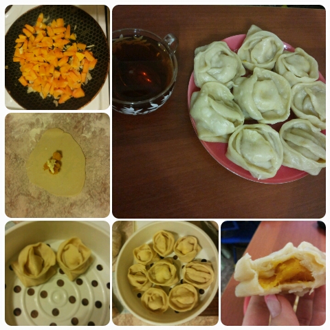 Начинка: тыкву порезать кубиками и обжарить на оливковом масле с луком, посолить по вкусу. Я еще добавила мускатный орех, корицу и имбирь. Замесить тесто как на пельмени, я сделала заварное тесто: два стакана муки, 1 яйцо и 2 ст.ложки подсолнечного масла, перемешать и залить стаканом кипятка - перемешать сначала ложкой, потом вымешать на столе до того как тесто перестанет прилипать. Сформировать манты и варить - очееень вкусно!